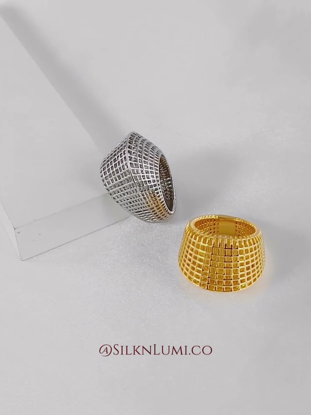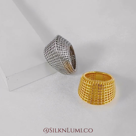 The Lumi Textured Basket Curve Rings, designed for those who embrace bold elegance. Available in refined silver and gold finishes, its unique curved texture adds depth and sophistication, making a striking statement for any occasion.